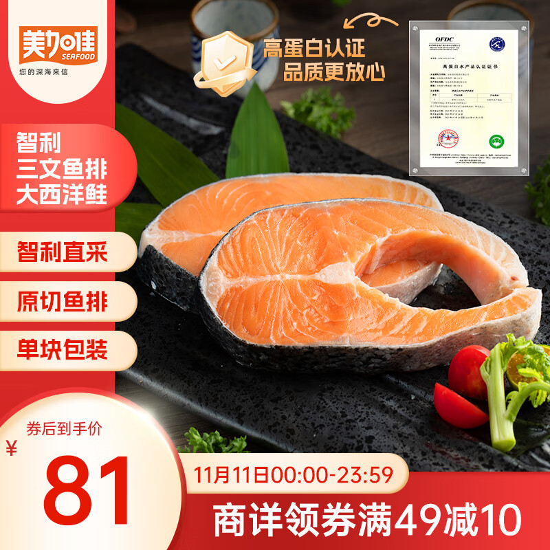 包邮 美加佳智利高蛋白三文鱼筒切(大西洋鲑)净重2斤(6-9袋)单块真空装